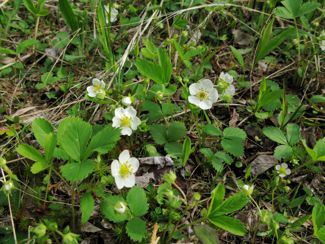 Found in patches in fields and dry openings, this plant produces the finest, sweetest, wild strawberry. The edible portion of the strawberry is actually the central portion of the flower (receptacle) which enlarges greatly with maturity and is covered with the embedded, dried, seed-like fruit. Cultivated Strawberries are hybrids developed from this native species and the South American one. The similar Wood Strawberry (F. vesca) has seed-like fruit on the surface, not embedded, and sepals that point backwards.