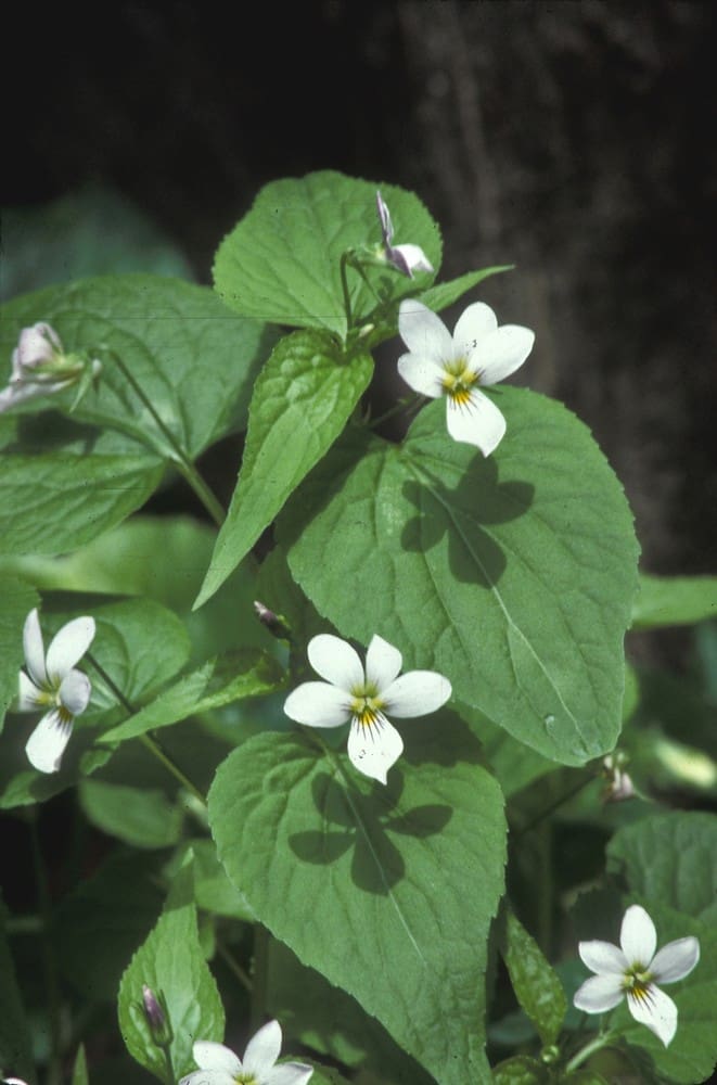 Canadian White Violet is a leafy-stemmed perennial, 8-16+ in. tall. The white flowers, sometimes tinged with purple, have yellow centers. Leaves are long-petioled, heart-shaped, and deep-green. Fragrant, white, bilaterally symmetrical flowers hang and face outward at tips of short, slender, purplish stalks that grow from axils of heart-shaped, fine-toothed leaves.